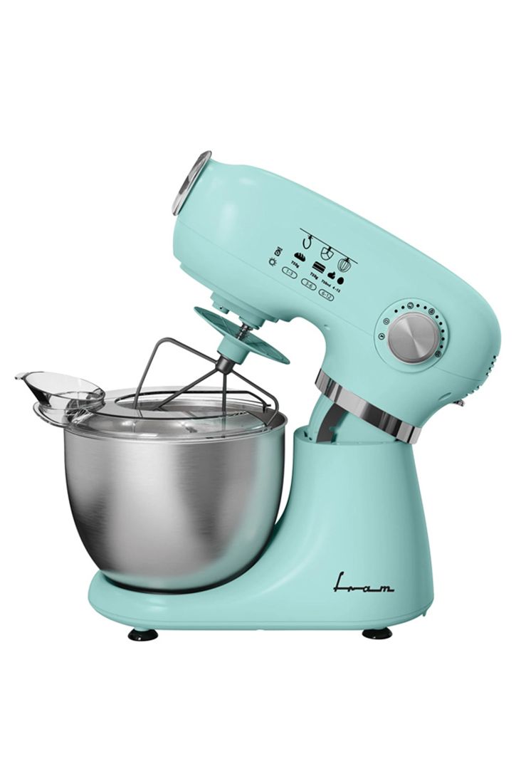 Posuda od nehrđajućeg čelika / Kapacitet: 5L / Snaga: 1000W / Metalni + plastični zupčanici / Dodaci: mutilica, lopatica za gnječenje i kuka obložena teflonom / Zaštita od prskanja / Boja: zelena