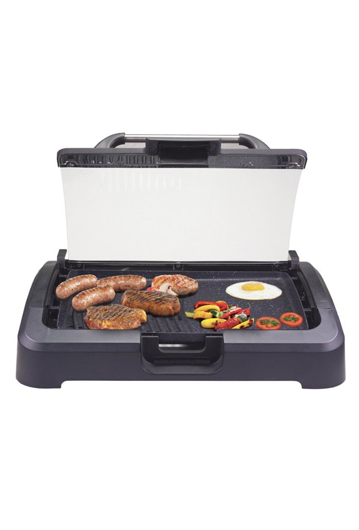 Električni roštilj s nosačem od otporne plastike i pločom od lijevanog aluminija s neprianjajućim premazom dimenzija 39x29 cm s toplinski izoliranim ručkama. Opremljen staklenim poklopcem s čeličnom ručkom za održavanje hrane toplom i sprječavanje prskanja tokom kuhanja. Uključena je aluminijska posuda za vodu za kuhanje bez dima. Termostat s 5 odabira temperature. Vrlo jednostavno čišćenje zahvaljujući potpuno uklonjivim komponentama.