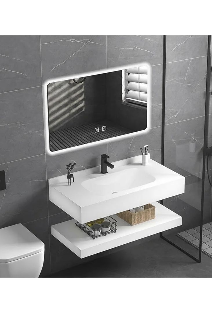 Ovaj kupaonički set uključuje umivaonik, prateću donju policu i LED ogledalo, čime se dobija kompletno rješenje za zidnu zonu kupatila. Svi elementi se montiraju direktno na zid.