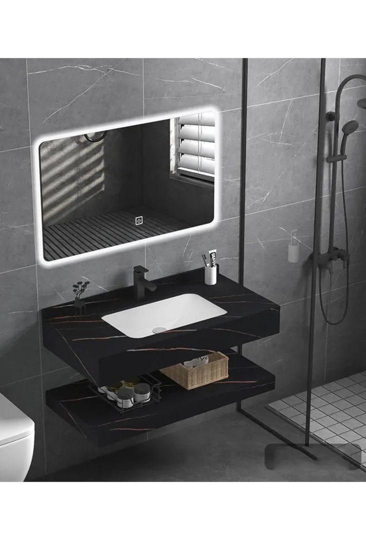 Ovaj kupaonički set uključuje umivaonik, prateću donju policu i LED ogledalo, čime se dobija kompletno rješenje za zidnu zonu kupatila. Svi elementi se montiraju direktno na zid. Širina 60 cm.