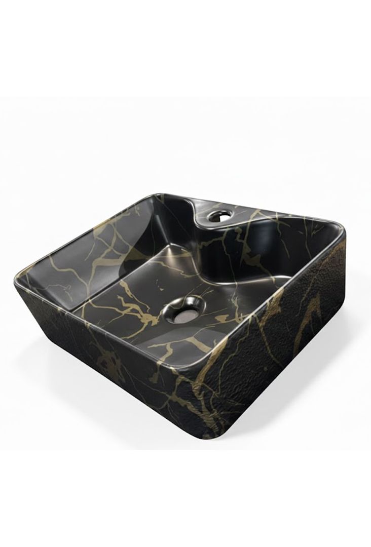 Tamna tekstura: Crna podloga sa zlatnim šarama vješto prikriva tragove kapi vode i sitne mrlje, pa umivaonik izgleda urednije između dva čišćenja.